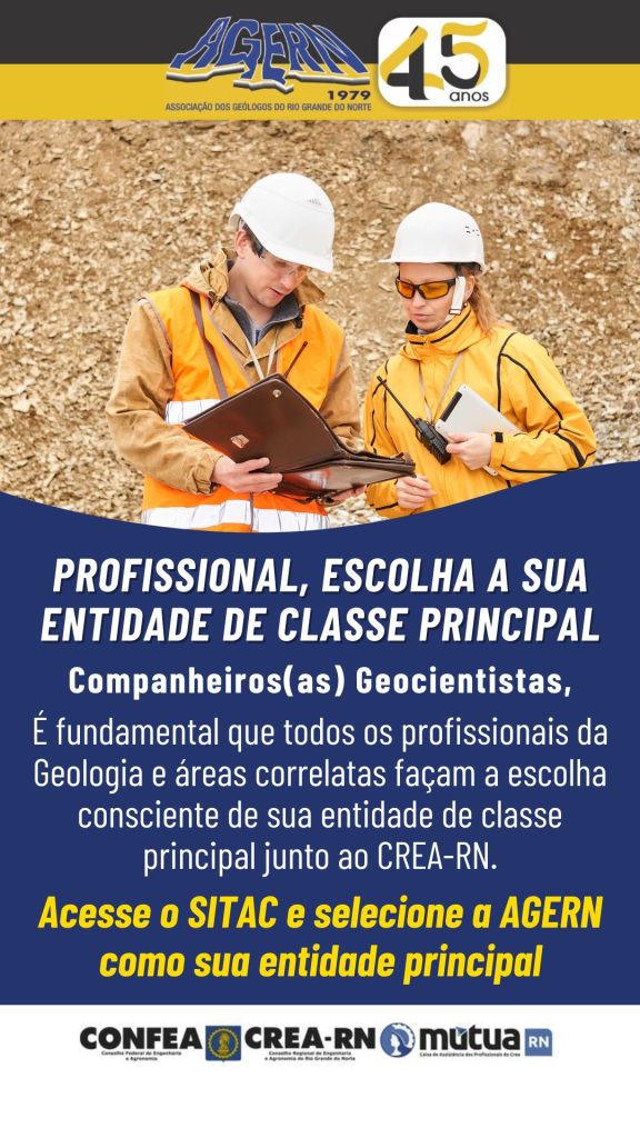 A AGERN – Associação dos Geólogos do Rio Grande do Norte atua com seriedade, representando os interesses da categoria, promovendo debates técnicos, participando de decisões institucionais e valorizando os profissionais das geociências em todo o estado.